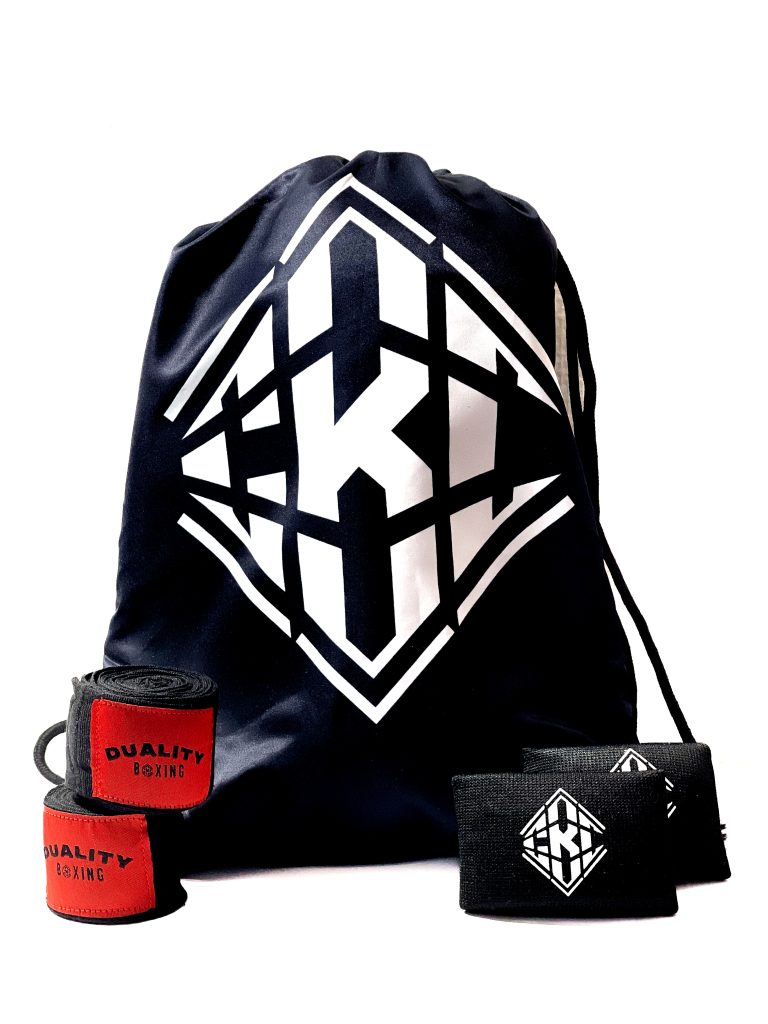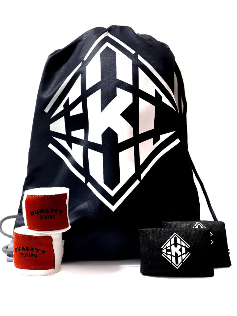 ce kit regroupe les bandes de boxe, les protections, le T-shirt officiel du club et le sac de transport.